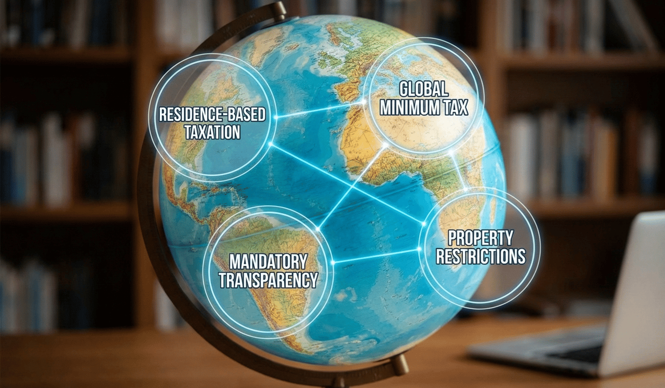 Residence-based taxation + global minimum tax + mandatory transparency + property restrictions